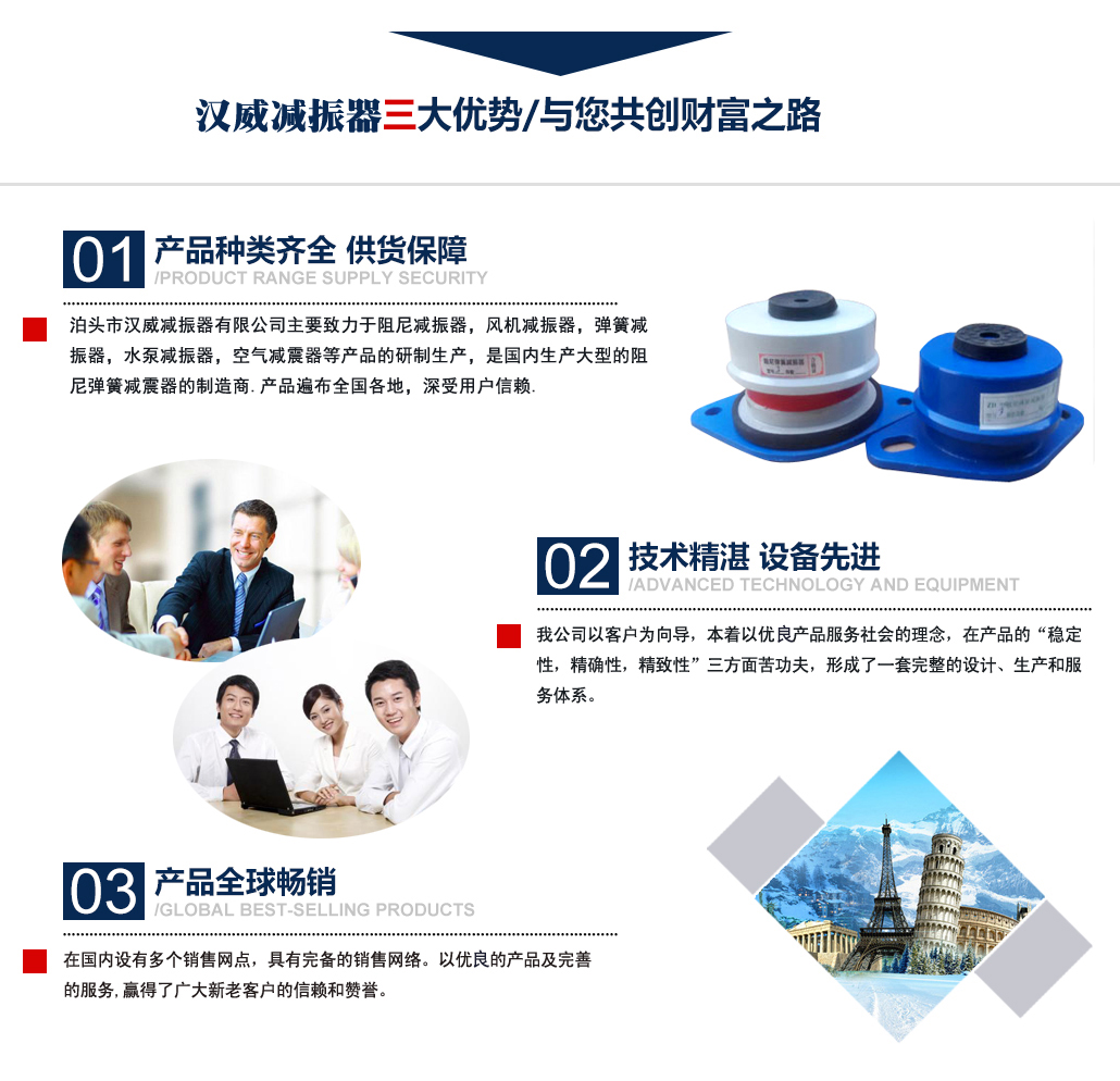 ?泊頭市漢威減振器有限公司主要致力于阻尼減振器,風機減振器,彈簧減振器,水泵減振器,空氣減震器等產品的研制生產,是國內生產阻尼彈簧減震器的制造商,產品廣泛用于中央空調、通風管道、鋼鐵、發電、石化、水泥和城市供熱等行業的各類管道和設備上,并在全國多地工程上得到應用,業績遍布全國多地,深受用戶信賴. 公司主要減振器系列產品有:中央空調系列減振器、泵房系列減振器、管道系列減振器、風機系列減振器、以及自行設計制作的系列隔振臺座。泊頭市漢威減震器科技有限公司擁有多名高素質技術人員,擁有完善的阻尼彈簧減震器生產和檢驗專用設備,擁有硅橡膠自動擠出生產線,全自動彈簧機等設備。生產條件逐漸完善進步,努力擴大生產規模,提高泊頭市減震器科技有限公司的生產競爭力。 多年來漢威減振器以三誠作為公司的字號,旨在立足當前......